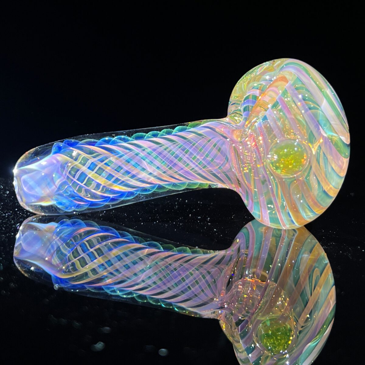 This thick glass fume pipe are so chunky and sturdy. Perfect amount of 24K gold and pure silver are fumed to the inside of the glass to create a color changing wonder of colors. Clear glass is then laid in lines to trap the fume and then twisted to form the nice spiral vortex.