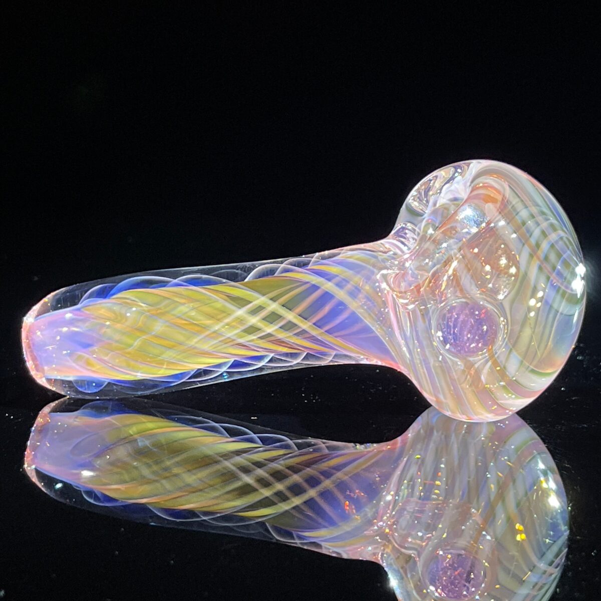 This thick glass fume pipe is chunky and sturdy. Perfect amount of 24K gold and pure silver are fumed to the inside of the glass to create a color changing wonder of colors. Clear glass is then laid in lines to trap the fume and then twisted to form the nice spiral vortex.