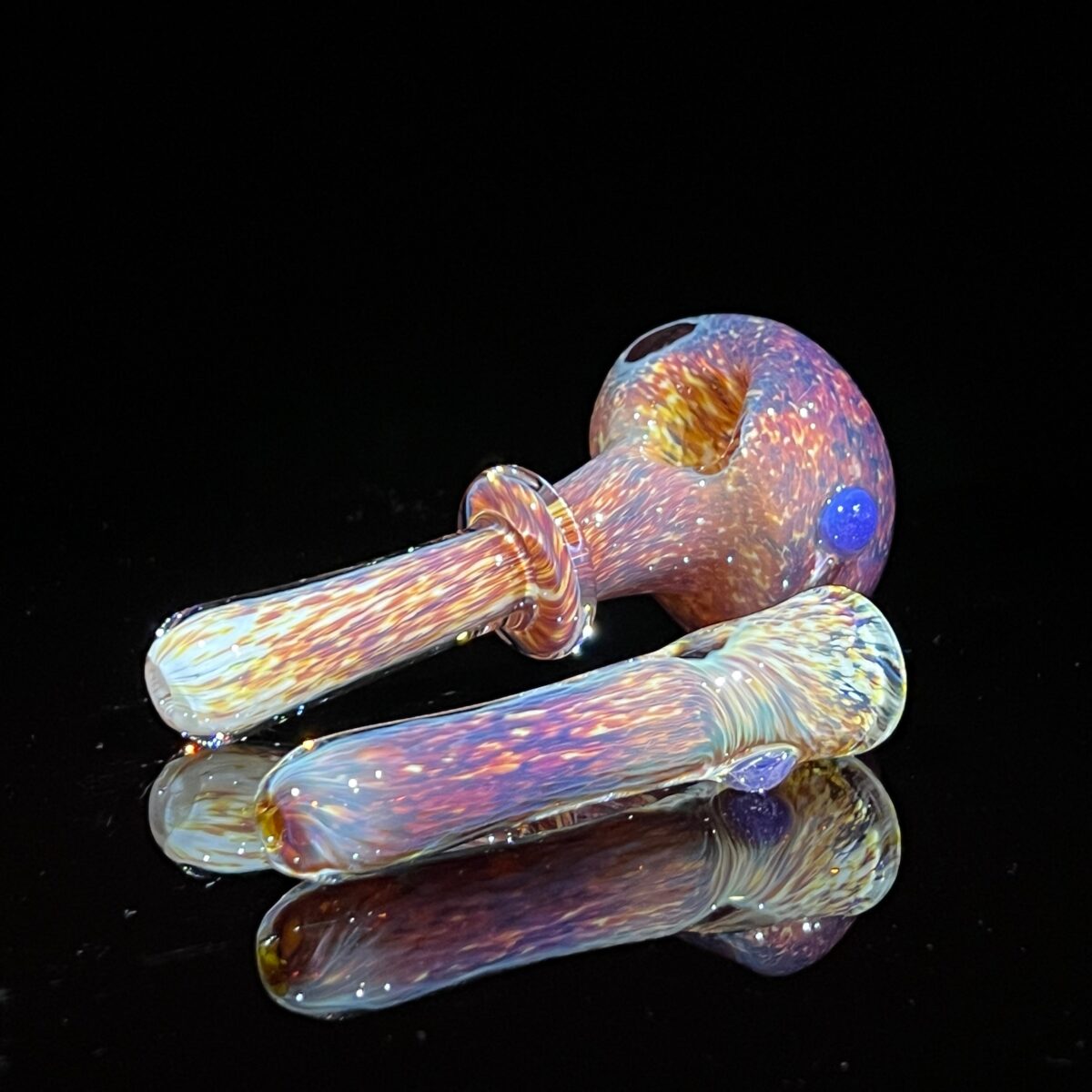This chillum is a color changer so the more you use it the sweeter and more pronounced the purple is going to become. The piece also has some fume coloring, so there will be accents of electric blue that will show up the more you use it. The pink slyme marble is great to keep your chillum from running away!