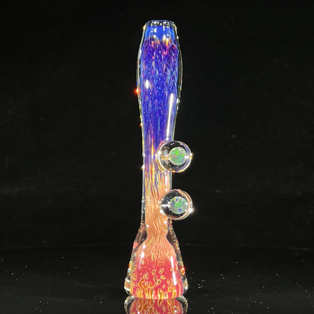 Breakfast at Tiffany’s just left earth with this insane Tiffany’s Sunset Black Planet Opal Chillum. This next-level elegant chillum is sure to turn heads. Thick glass with the Tako’s classic fuzzy purple clouds, but with some tropical sunset colors and black planet opals in the mix! These 2 opals are encased in magnifying marbles that bring them to life. These opals fire red, green and blue with a full spectrum of colors inbetween!