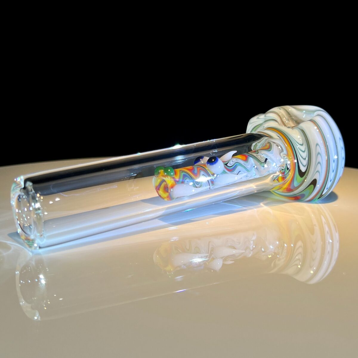 Dragons have entered our realm and captured in our Spiral Dragon Spoon. The glass has spirals throughout in rainbow lines against a cloud….literally mesmerizing. The Dragon head shines bright with the eerie UV/Glow in the Dark eyes and horns.