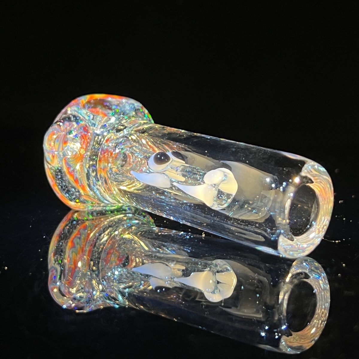 Dragons have entered our realm and captured in our Mini Wig Wag Crushed Opal Dragon. You can find this dragon protecting its treasures of opal jewels as you puff away on the pipe. In the dark you can feel it gaze upon you with its UV/Glow in the dark eyes and horns. It has the trippiest glow to really enhance the amazing details in the glass.