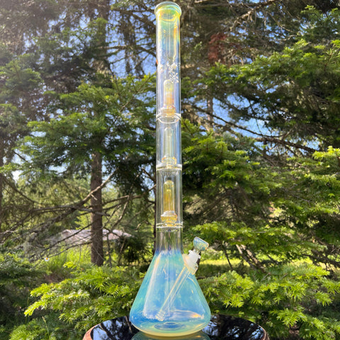 Or maybe you found that secluded spot by the water, with no one around but your best buddies and that sweet herb. That calls for breaking out the big guns! Those tall bongs that are sure to produce so massive clouds and send your brain to the clouds as well. Here at Tako Glass we love a big bong with lots of percs to filter those hot smoke clouds ensuring you not only take the fattest rips, but the smoothest ones as well. Meet the 25″ Fumed Quad Beaker Bong. Standing over two feet tall featuring quad percs, fumed color changing glass, and made with 50mm thick tubing- this bong is a fatty for sure!